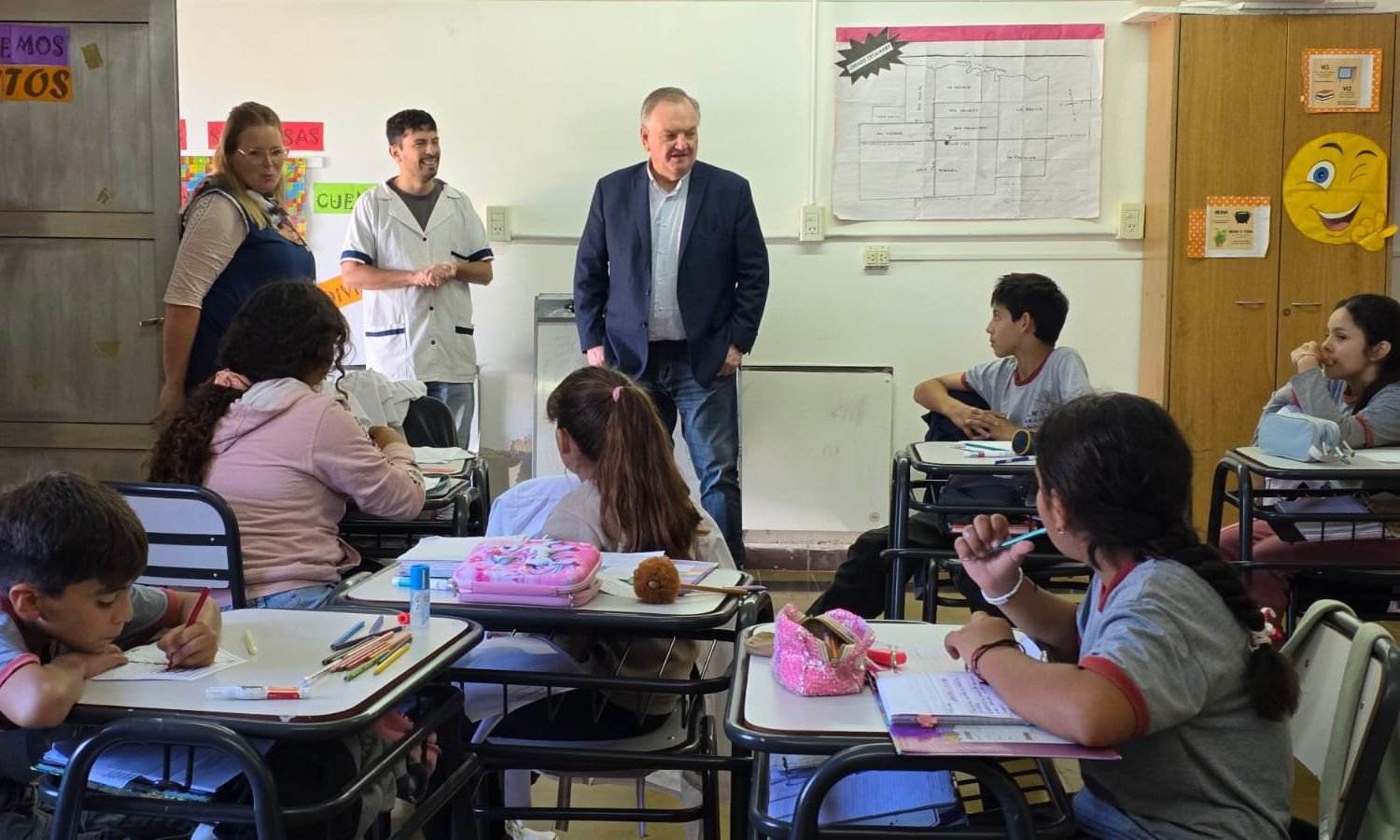 Seguidamente, las autoridades visitaron el Núcleo Rural N.R.E.S. N°1611 «Guillermo Luis Fradegrada» Estancia San Francisco, donde fueron recibidos por la directora del nivel primario, Cecilia Morelli; la coordinadora María Elena Vender; la docente de nivel inicial Evelin Zender; y el maestro de grado Gonzalo Córdoba.